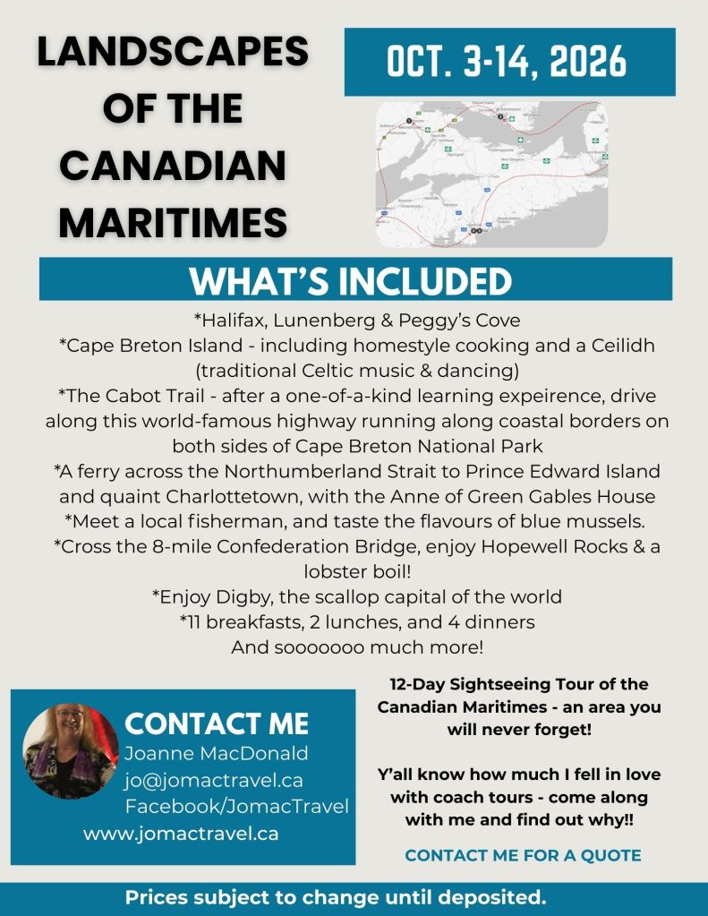 LANDSCAPES OF THE CANADIAN MARITIMES – explore much more than you can see from the cruise with Insight Coach Tours. This is one I am looking very much forward to!